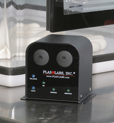 The #800 AS/SPI “Counter SPI” ionizer emits alternating positive and negative Ions that eliminate static electricity within the glove box. It is non-air assisted (no fan), so there is no atmosphere turbulence inside the chamber. Additionally, no particle